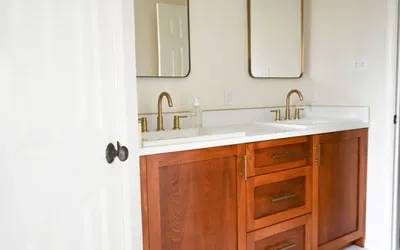On this project, we added new lighting fixtures and sleek hardware to all the cabinets and drawers, giving the space a modern touch. The teal cabinets add a pop of color and personality to the kitchen, while the desert themed wallpaper and gold finishes in the bathrooms give a whimsical yet luxurious feel. The new vanities provide ample storage space, and the new shower in the primary bathroom adds a touch of spa-like relaxation. Overall, this project transformed the space into a cohesive and stylish oasis.